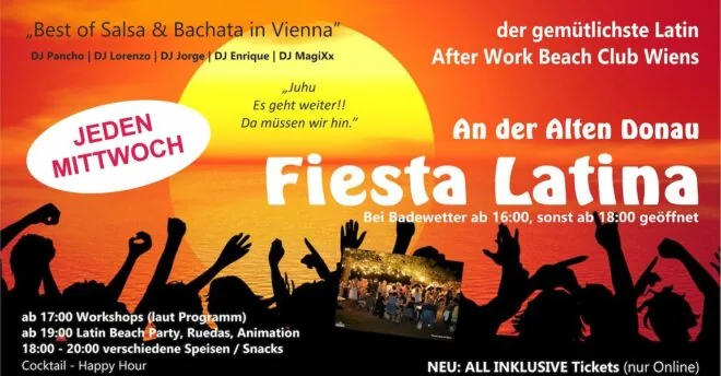 It’s about to get very, very hot in Vienna. So, it’s time for the hot-hot Salsa & Bachata summer party at the Danube. Every Wednesday, there will be DJs, snacks, drinks, and dancing.